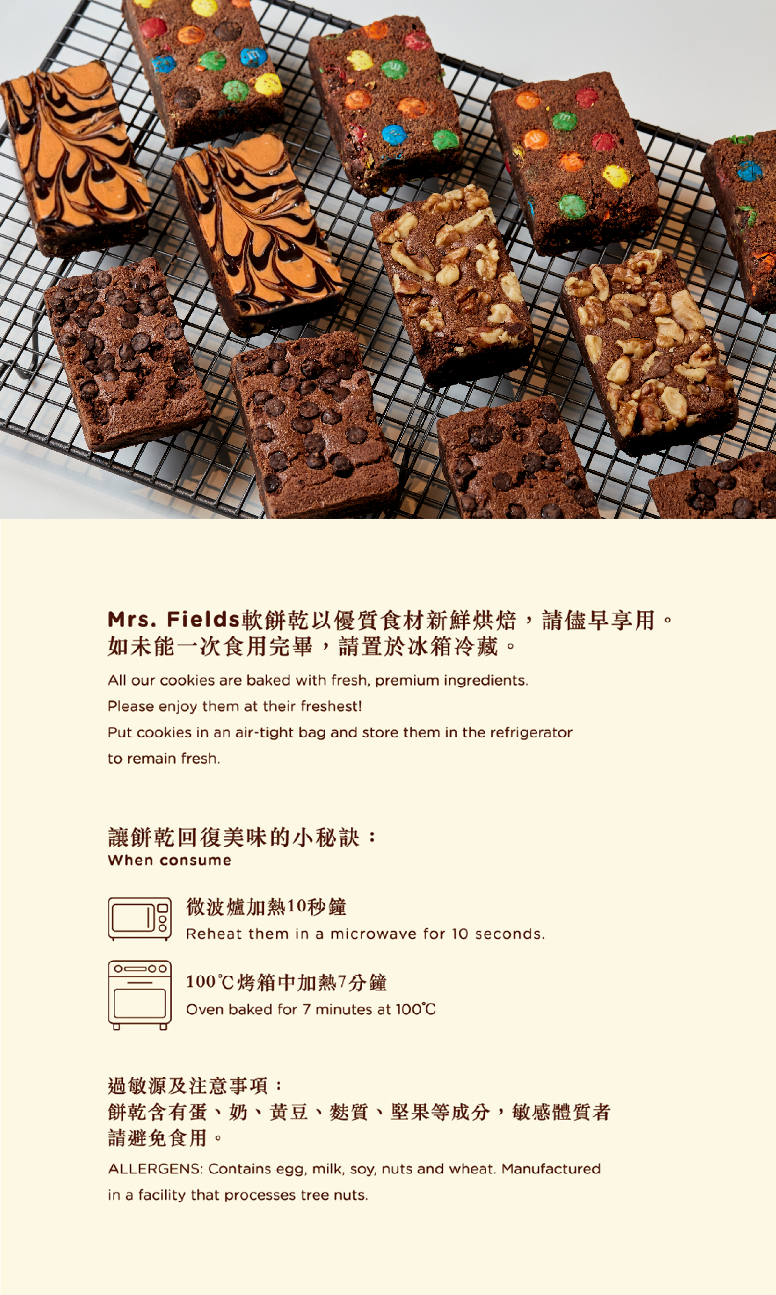 餅乾含有蛋、奶、黃豆、麩質、堅果等成分,過敏體質者請避免食用
